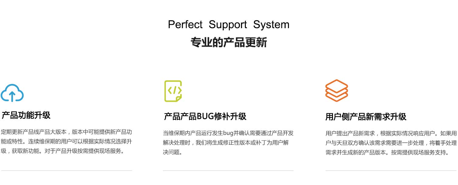 产品升级:包括“产品功能更新升级”、“产品bug修补升级”、“用户侧产品新需求升级”产生的升级需求。如果远程支持无法完成,提供现场处理。